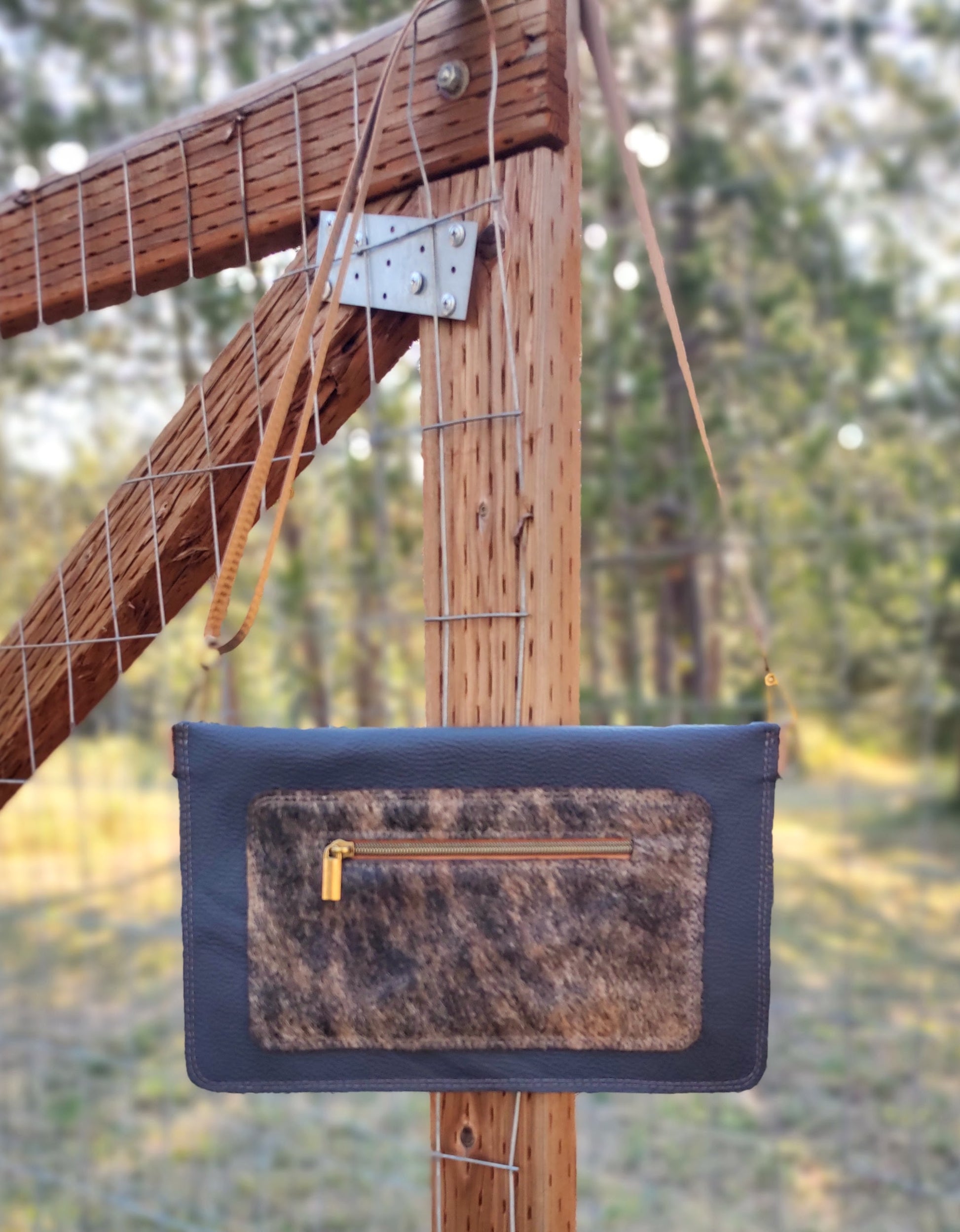 Espresso colored leather bag can be worn as a crossbody or waist/hip bag. Brindle cowhide zipper front pocket, reverse side has a slip pocket as well as a zippered pocket which opens up to access three card slots inside. Premium nylon webbing strap is adjustable from 23 1/2 to 44 1/2 inches with antique brass bag hardware. Unlined.